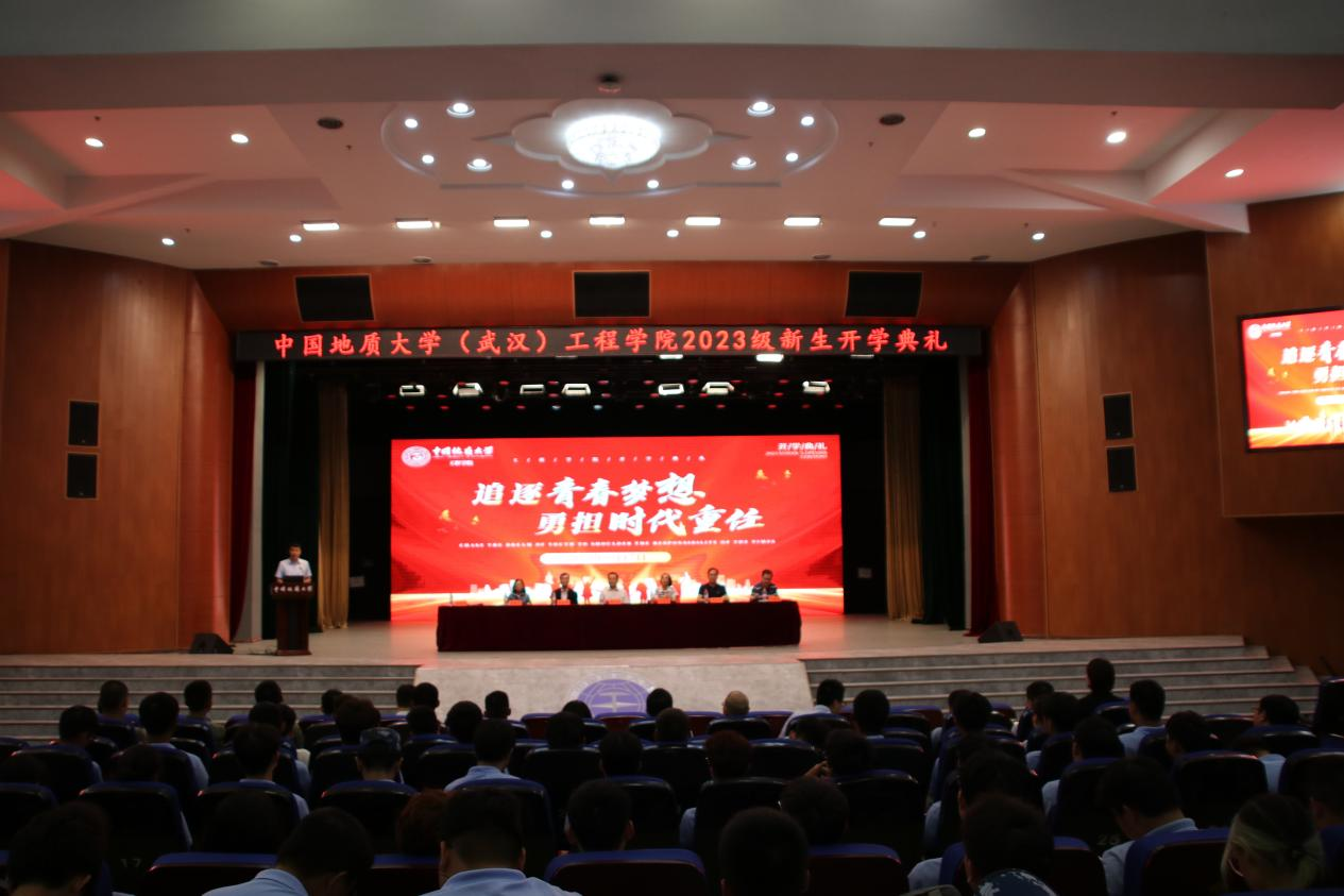 (通讯员 贾彦平)莘莘学子汇江城,工程栋梁破凌云。9月17日下午,中国地质大学(武汉)工程学院2023级新生开学典礼在南望山校区弘毅堂隆重举行。学院党委书记李红丽,党委副书记、院长焦玉勇,党委副书记、纪委书记高晓东,副院长王亮清、窦斌、倪晓阳、章广成,各系教工党支部书记、系主任,学院研究生导师代表,2023级本科生班主任,全体辅导员、军训教官代表以及506名本科生、298名硕士生、56名博士生参加典礼。中建科工旗下中建钢构股份有限公司首席专家、教授级高级工程师、“全国道德模范”、“全国五一劳动奖章”获得者陆建新,工程学院2000级土木工程专业校友、湖北道泽勘测设计院有限公司总工程师谢昭宇两位嘉宾受邀出席。高晓东主持典礼。