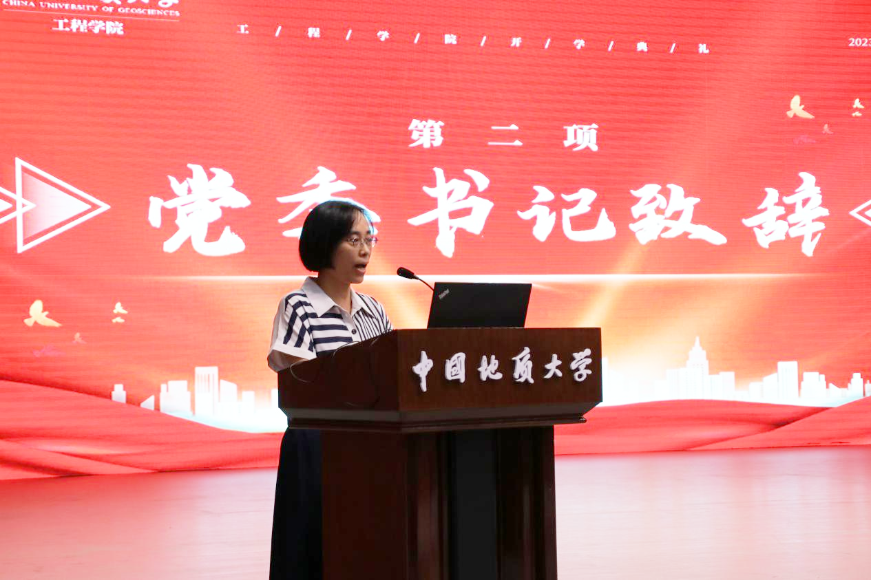 工程学院党委书记李红丽致辞。李书记首先代表全院师生员工对加入工程学院的860名新成员致以热烈的欢迎,祝福同学们选择了工程学院这个温暖而又奋进的大家庭。她指出,当代大学生正值云程发轫、万里可期的青春韶华,要全面学习学院的辉煌历史,深刻感受学院的使命担当,铭记院训深意,争做时代栋梁。要“明理”,即明辨是非,通晓道理,要明白做人之理、为学之理、尊法之理;要“尚实”,即崇尚务实作风,要在实处用力,在知行合一上下功夫;要“拓新”,即开拓创新,要面向世界科技前沿、面向经济主战场、面向国家重大需求、面向人民生命健康,解放思想,开拓创新,与时俱进;要“砺行”,即砥砺前行,在攻坚克难中磨砺心性,坚守初心,锻造本领,成长成才。她勉励同学们以院训精神为指引,树牢远大志向、矢志不懈奋斗,努力学习,潜心科研,乐观开朗,积极向上,做堪当时代大任的新时代地大工程人,为建设社会主义现代化国家做出属于青年一代的贡献。