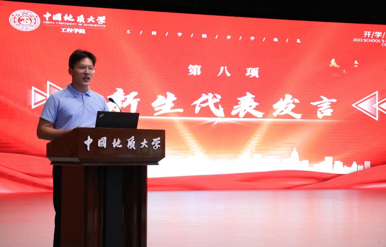 2023级05D231班张高涵同学作为本科生新生代表发言。他说,在长辈厚重岩土气息的熏陶下,自己终于如愿考进地质大学,加入工程学院。他对开学报到以来学院领导老师给予的教育关怀表示感谢,对军事训练当中空军预警学院教官对自己坚忍毅力和良好作息的打造由衷感激,他立志与其他505名本科新生同学一道,以强国建设、民族复兴的时代号召为号角,以“品德高尚、基础厚实、专业精深、知行合一”的成才目标为向导,直挂云帆,乘风破浪,早日成为德智体美劳全面发展的中国特色社会主义事业的建设者和接班人。