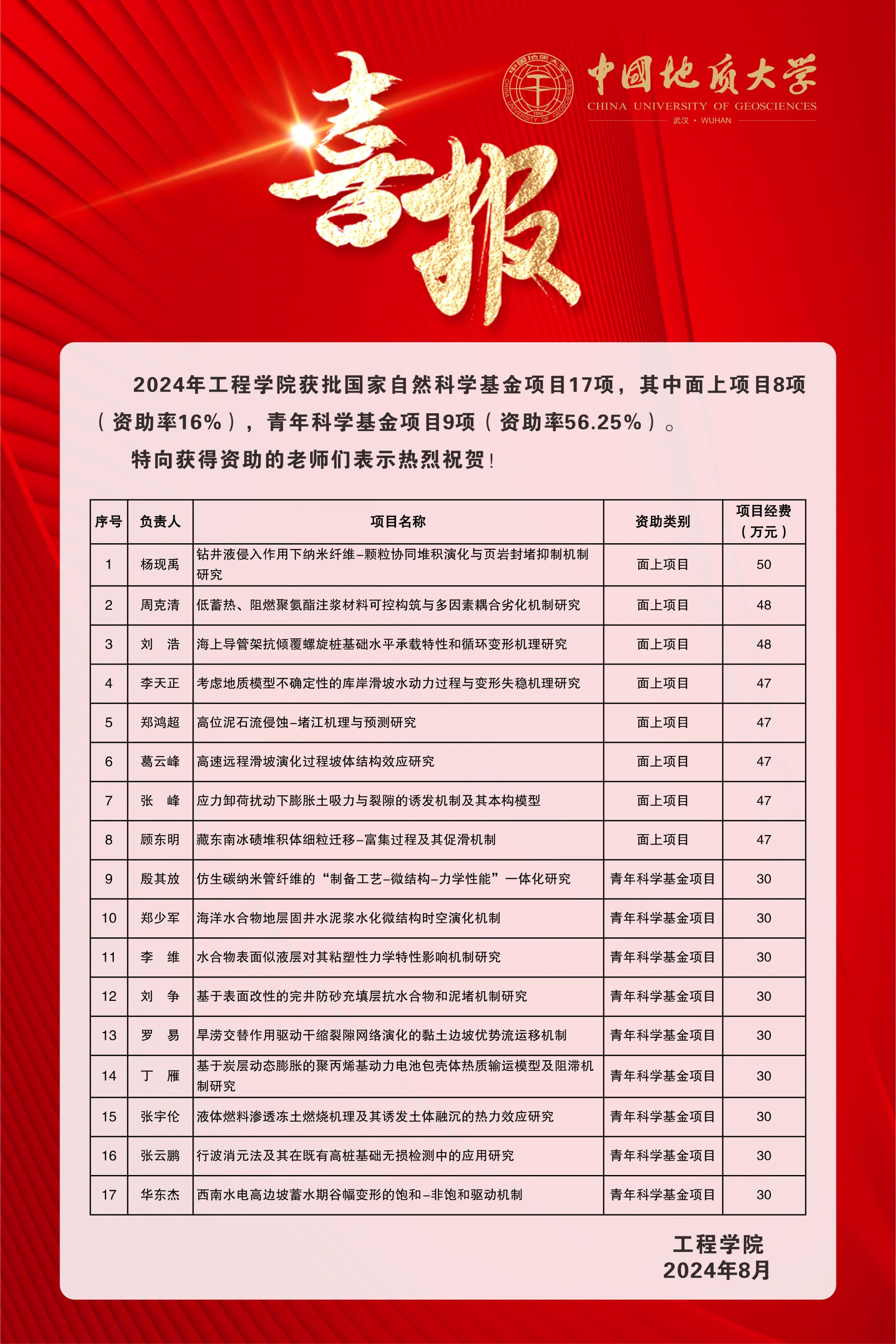 喜报:工程学院获批国家自然科学基金项目17项